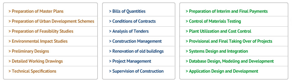 We provide comprehensive professional consultancy services in areas of engineering and Project Management.We are in a position to direct and coordinate the work of different professionals appointed by any authority for a project. These services are available to clients in private and public sectors and include review and coordination.We also provide design services for preliminary to detailed levels through our own staff.Whenever the circumstances demand,we arrange to have the services of specialist consultants and service groups.